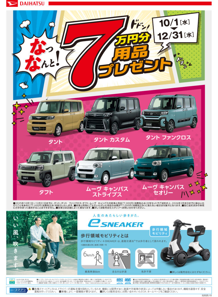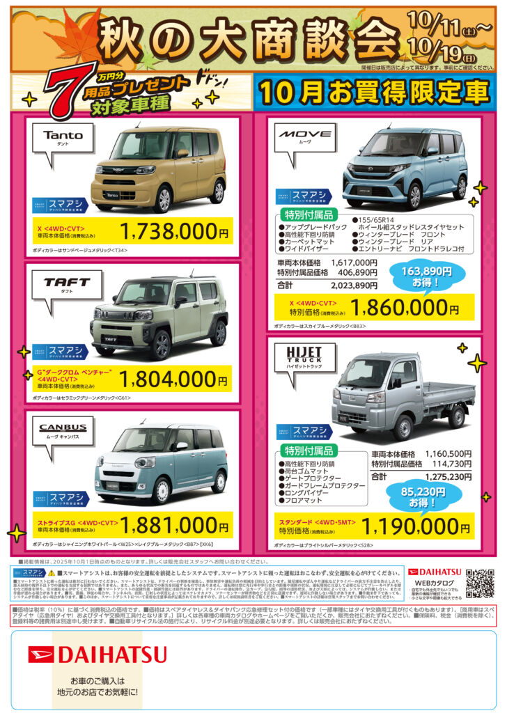 2025.10.03 10/11(土)~10/19(日)お買い得限定車など取り揃えて秋の大商談会実施致します 特別限定車以外の(タント・タントカスタム・タントファンクロス・タフト・ムーヴキャンバス・ムーブキャンバスセオリー)は純正用品をなんと7万円分プレゼント実施中!10/1(水)~12/31(水)まで